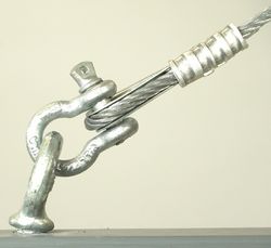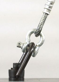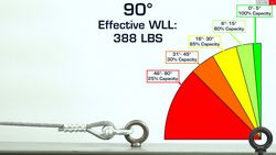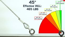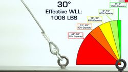 This cable is at 0 degrees. At 0 to 5 degrees, the eye bolt is rated at 100 percent of its working load limit. In this case, the catalog working load limit of this 3/8th inch eye bolt is 1,550 pounds.